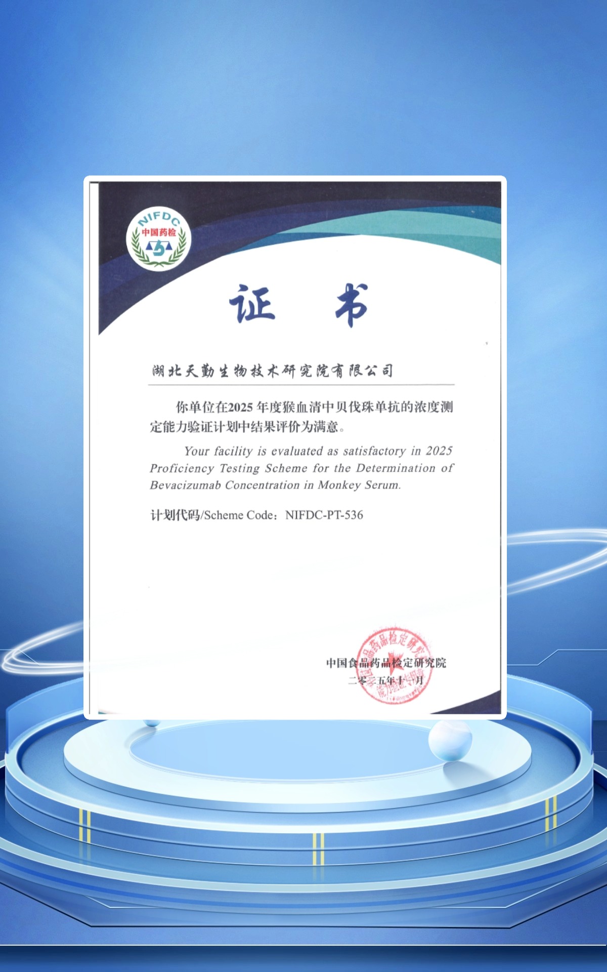近日,天勤生物核心研發(fā)機構天勤研究院(以下稱“天勤研究院”)在中國食品藥品檢定研究院(以下稱“中檢院”)組織開展的 “2025年度猴血清中貝伐珠單抗的濃度測定能力驗證”(計劃代碼:NIFDC-PT-536)中,全部樣本檢測結果準確,結果評價為 “滿意”。