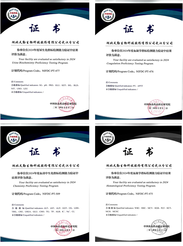 在血清中生化指標(biāo)(NIFDC-PT-509)、血液學(xué)指標(biāo)(NIFDC-PT-475)、血凝學(xué)指標(biāo)(NIFDC-PT-476)和尿生化指標(biāo)(NIFDC-PT-477)四個關(guān)鍵項目的能力驗證過程中,天勤生物武漢分公司提交了全部37個能力驗證指標(biāo),且所有項目均以滿分100分通過,最終獲得“滿意”的最高等級認(rèn)定。在臨床檢驗領(lǐng)域,天勤生物武漢公司不僅配備了先進(jìn)的儀器設(shè)備,還建立了完善的實驗室質(zhì)量控制體系,并擁有一支高技能的專業(yè)團(tuán)隊,這一系列優(yōu)異的成績充分展示了天勤生物武漢分公司在臨床檢驗領(lǐng)域的扎實功底。