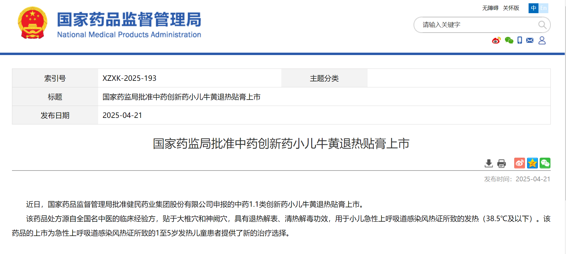 2025年4月21日,由天勤生物提供非臨床安全研究技術支持的健民集團中藥1.1類創新藥小兒牛黃退熱貼膏,正式獲得國家藥品監督管理局批準上市。作為該項目核心研究合作方,天勤生物通過多項定制化毒性試驗與安全性評價研究,為該兒科藥物獲批上市提供了科學支撐。